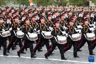 5月9日,在俄羅斯首都莫斯科,鼓手編隊(duì)走過紅場。新華社記者 白雪騏 攝