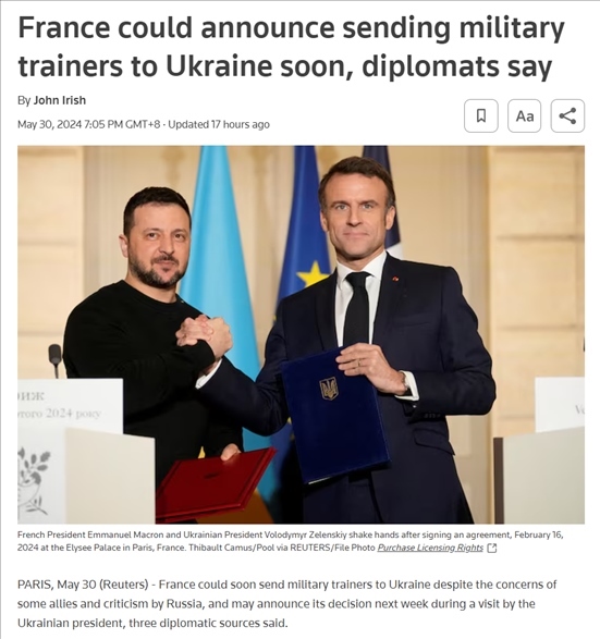 5月30日,路透社援引三位匿名外交消息人士稱,法國可能很快會向?yàn)蹩颂m派遣軍事教官。
