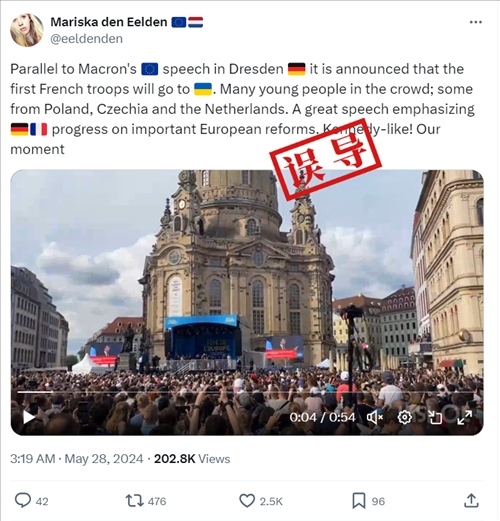 視頻顯示的內(nèi)容系馬克龍?jiān)谘葜v開篇用德語對現(xiàn)場來賓進(jìn)行問候,未提到法國軍隊(duì)。核查馬克龍?jiān)诘吕鬯诡D的演講內(nèi)容發(fā)現(xiàn),在近40分鐘的演講期間,馬克龍共有16次提到“烏克蘭”,但其中沒有內(nèi)容是與向?yàn)蹩颂m派遣法國軍隊(duì)相關(guān)的。