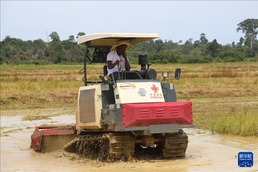 5月31日,在位于科特迪瓦南部迪沃省的格格杜墾區(qū),當(dāng)?shù)胤N植戶在水稻田里操作農(nóng)機(jī)作業(yè)。新華社記者 張健 攝