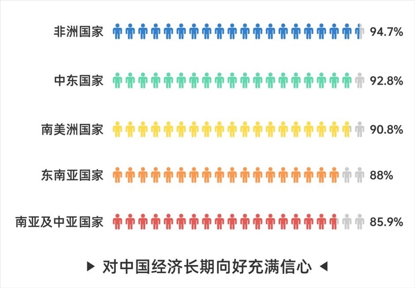 另有89.2%的受訪者肯定中國(guó)經(jīng)濟(jì)對(duì)世界經(jīng)濟(jì)的卓越貢獻(xiàn),較去年上升9.7個(gè)百分點(diǎn),非洲國(guó)家、中東國(guó)家和南美洲國(guó)家受訪者的認(rèn)同度分別為96.3%、95.2%和93.9%。