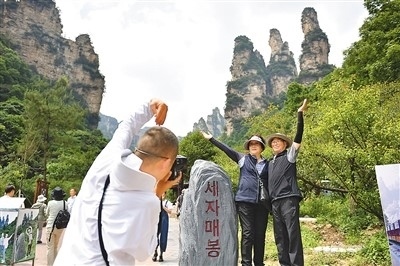 今年前往湖南省張家界市旅游的韓國游客數(shù)量大幅增長。圖為在張家界國家森林公園十里畫廊景區(qū),韓國游客在“三姐妹峰”前拍照留影。新華社記者 陳振海攝