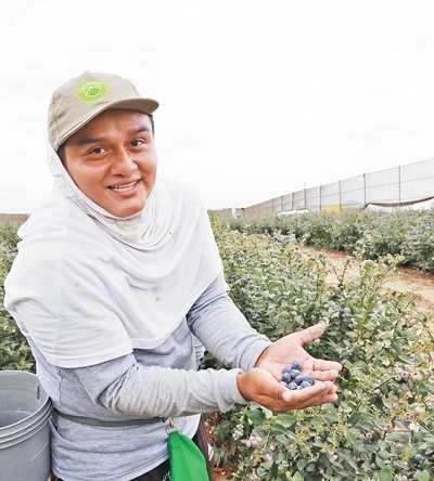 在秘魯特魯希略市一家農(nóng)場里,一名采摘工人在展示他剛摘下的藍(lán)莓。本報記者 顏 歡攝