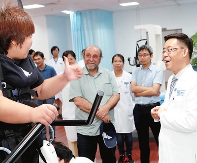 尼科萊利斯(中)與醫(yī)務(wù)人員共同指導(dǎo)截癱患者使用外骨骼康復(fù)機(jī)器人進(jìn)行步行訓(xùn)練。