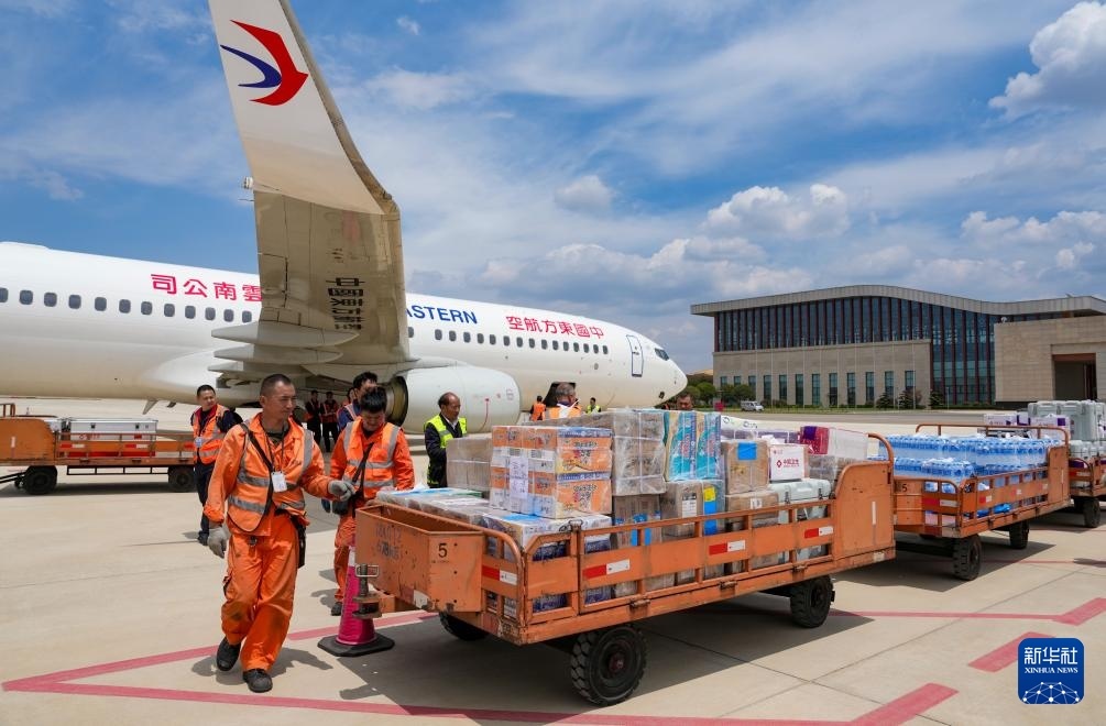 4月19日,工作人員在昆明長水機(jī)場(chǎng)將中國政府援緬衛(wèi)生防疫隊(duì)攜帶的物資裝機(jī)。新華社記者 陳欣波 攝