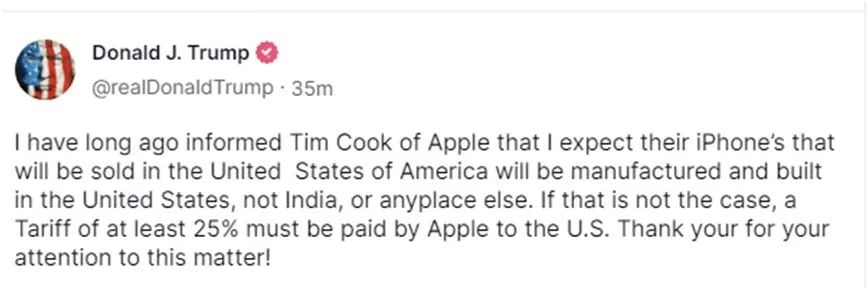 針對蘋果,特朗普說,他“很早之前就告訴過蘋果公司的(首席執(zhí)行官)蒂姆·庫克,我希望他們在美國銷售的蘋果手機是在美國生產(chǎn)和制造,而不是在印度或者其他什么地方”,“如果不是這樣的話,蘋果公司必須向美國支付至少25%的關稅”。