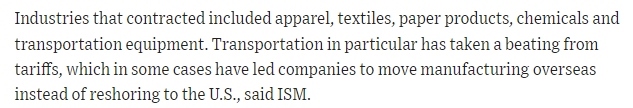 文章指出,美國制造業(yè)活動萎縮的行業(yè)主要包括服裝、紡織品、紙制品、化工產(chǎn)品和運輸業(yè)。文章表示,雖然當前美國工廠產(chǎn)量有所增加,但未售出的庫存卻急劇增加。需求增長放緩,這在出口市場體現(xiàn)尤為明顯,而受關(guān)稅影響,出口市場的前景更加暗淡。
