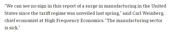文章指出,美國政府曾辯稱,加征關(guān)稅是保護美國國內(nèi)制造業(yè)的必要之舉,但經(jīng)濟學(xué)家則認為,由于包括勞動力短缺在內(nèi)的結(jié)構(gòu)性問題,美國制造業(yè)已無法恢復(fù)昔日輝煌。文章援引高頻經(jīng)濟咨詢公司首席經(jīng)濟學(xué)家卡爾·溫伯格(Carl Weinberg)的話表示,“從(ISM)這份報告中,我沒有看到自關(guān)稅政策出臺以來,美國制造業(yè)出現(xiàn)任何增長的跡象,美國制造業(yè)已經(jīng)病了?!?/p>