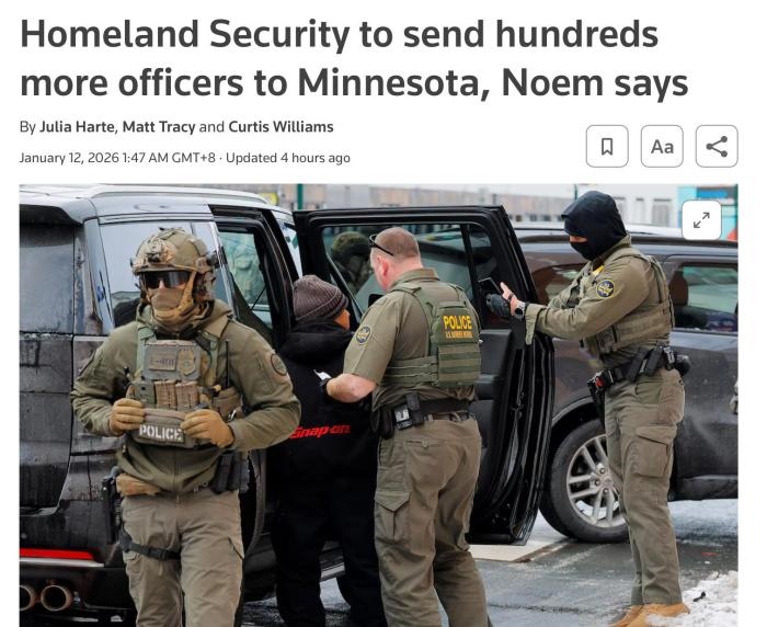中新網(wǎng)1月12日電 綜合路透社等外媒報道,當(dāng)?shù)貢r間11日,美國國土安全部部長諾姆表示,國土安全部將向明尼蘇達州增派“數(shù)百名”警員。