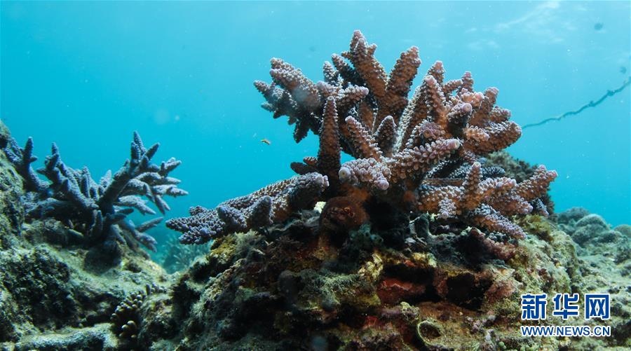 這是海南三亞蜈支洲島海域海洋牧場內生長的珊瑚(4月29日攝)。新華社記者楊冠宇攝