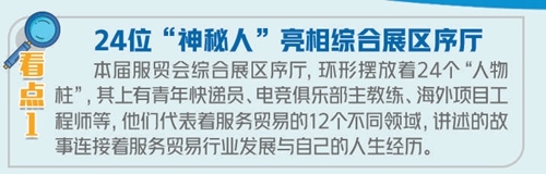 穿過展示屏區(qū)域,可以看到24根“人物柱”,上面展示著來自服務貿易十二大領域“行業(yè)故事講述人”的工作和生活故事。