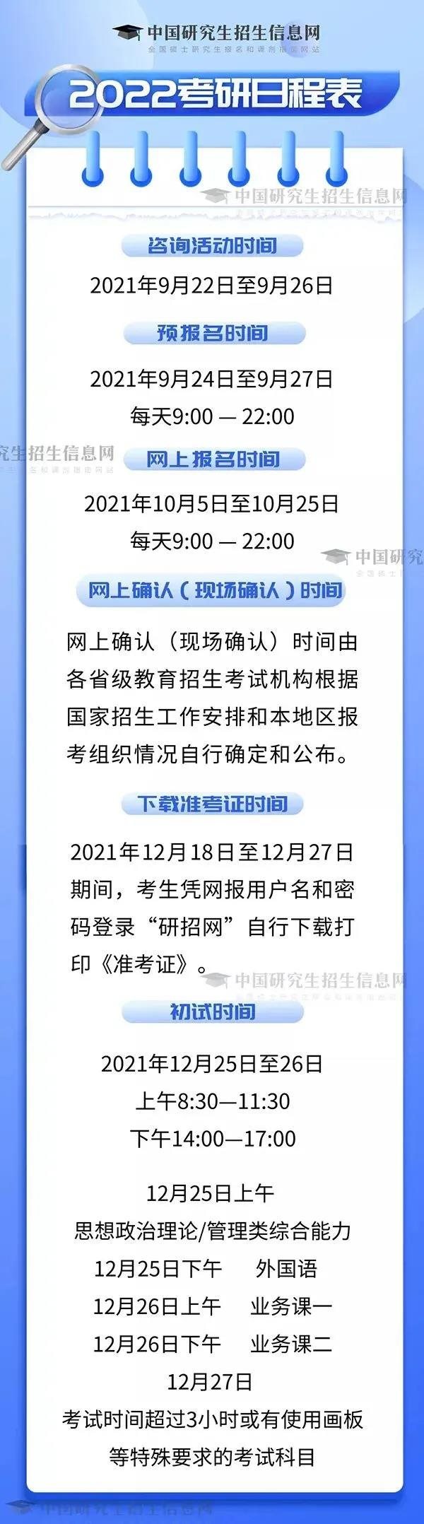 根據(jù)《2022年全國碩士研究生招生工作管理規(guī)定》,2022年研考網(wǎng)上報名時間為2021年10月5日至10月25日。網(wǎng)上預(yù)報名時間為2021年9月24日至9月27日。