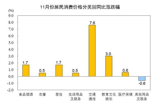 其他七大類價(jià)格同比六漲一降。其中,交通通信、教育文化娛樂(lè)、居住價(jià)格分別上漲7.6%、3.0%和1.7%,醫(yī)療保健、衣著、生活用品及服務(wù)價(jià)格分別上漲0.6%、0.5%和0.5%;其他用品及服務(wù)價(jià)格下降0.6%。