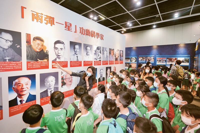 2021年6月27日至7月9日,“時代精神耀香江”之百年中國科學家主題展在香港向公眾開放。圖為7月7日,眾多小學生仔細聆聽講解員的介紹。中新社記者張煒/攝