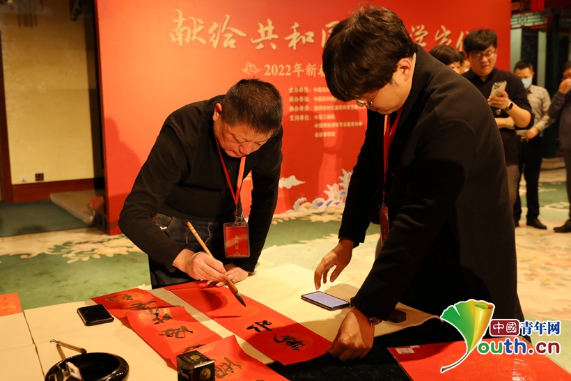 在節(jié)目錄制現(xiàn)場(chǎng),主辦方還邀請(qǐng)了兩位書(shū)法家,現(xiàn)場(chǎng)揮毫潑墨,為科學(xué)家和藝術(shù)家們書(shū)寫(xiě)"福"字和春聯(lián),并借此向全國(guó)的科技工作者、文藝工作者和觀眾朋友們致以新春佳節(jié)的問(wèn)候。