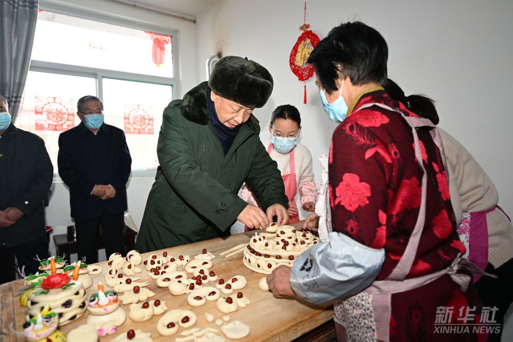 2022年1月26日下午,習(xí)近平在臨汾市霍州市師莊鄉(xiāng)馮南垣村,同師紅兵一家做年饃。