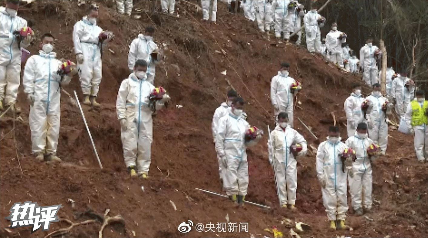 3月27日下午,“3·21”東航MU5735航空器飛行事故遇難者集體哀悼活動在事發(fā)地搜救現(xiàn)場舉行。全場鳴笛,國家應急處置指揮部全體人員、事故現(xiàn)場搜救人員等面向遇難飛機方向肅穆而立,默哀三分鐘,以此寄托對遇難者的哀思。