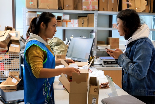 2019年11月13日,寄件員使用回收紙盒幫顧客包裝需要快遞的物品。新華社記者方喆攝