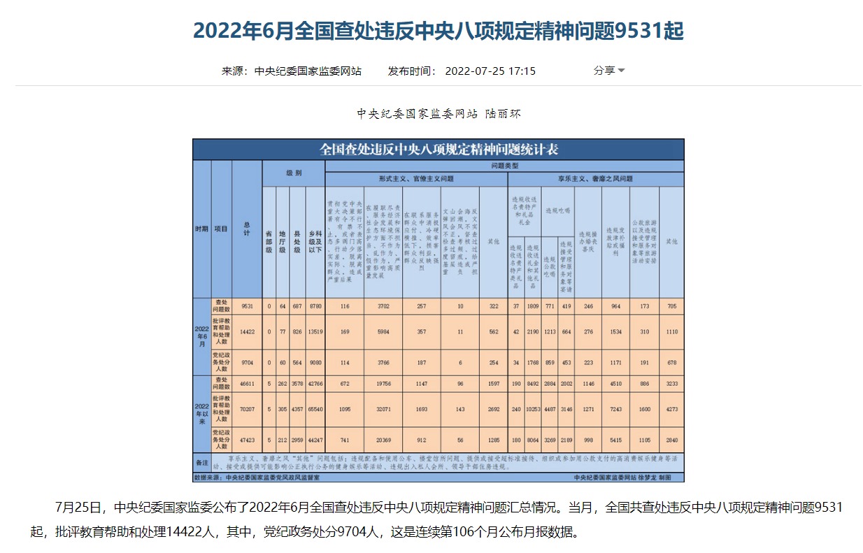從公布的月報(bào)數(shù)據(jù)看,當(dāng)月(6月),全國共查處違反中央八項(xiàng)規(guī)定精神問題9531起,批評(píng)教育幫助和處理14422人,其中,黨紀(jì)政務(wù)處分9704人。