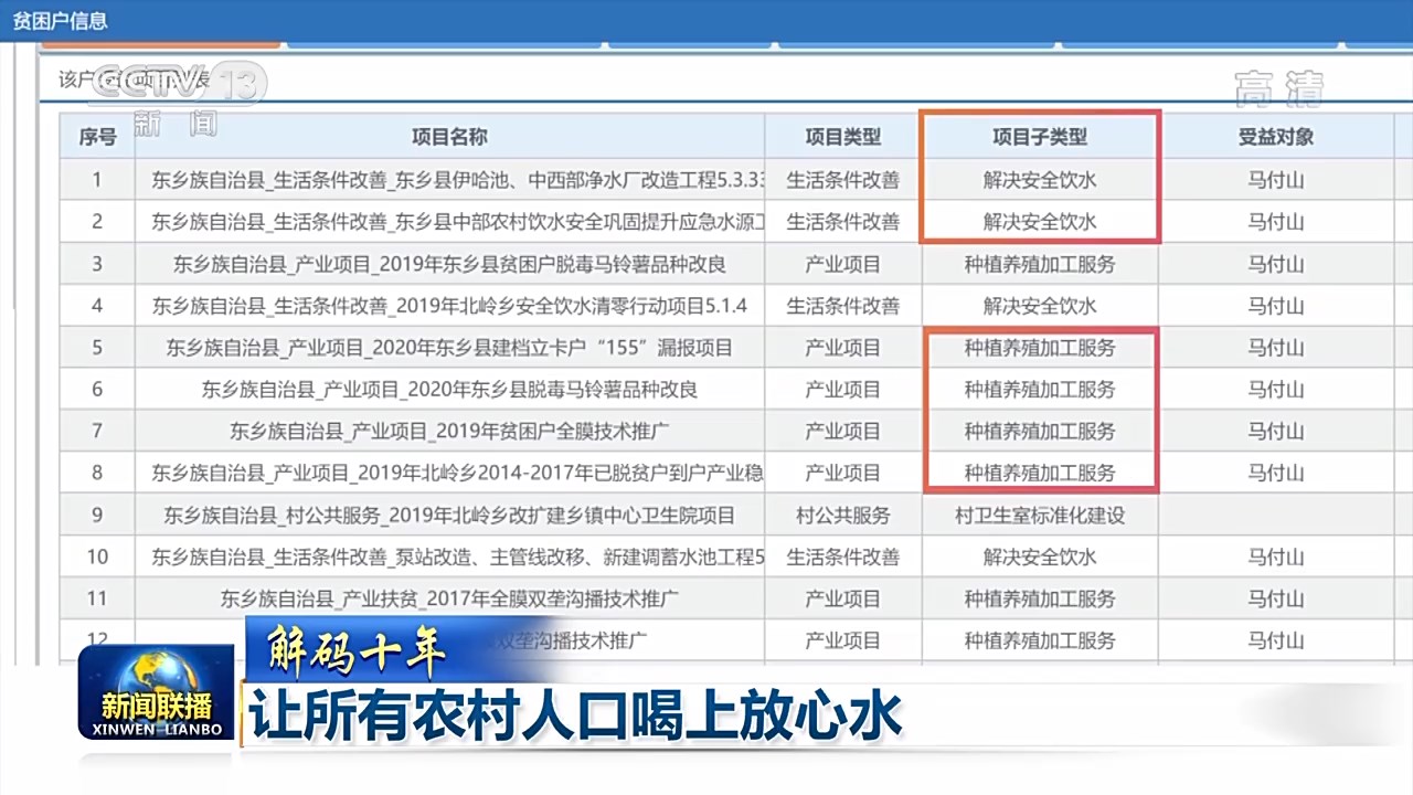水能解渴,更能致富。在全國扶貧開發(fā)信息系統(tǒng)中,我們找到了過去十年中“因水致貧”的家庭。當我們查詢這些貧困戶的脫貧措施和鞏固提升措施,可以看到“解決安全飲水”和“特色種植、養(yǎng)殖產(chǎn)業(yè)”總會同時出現(xiàn)。