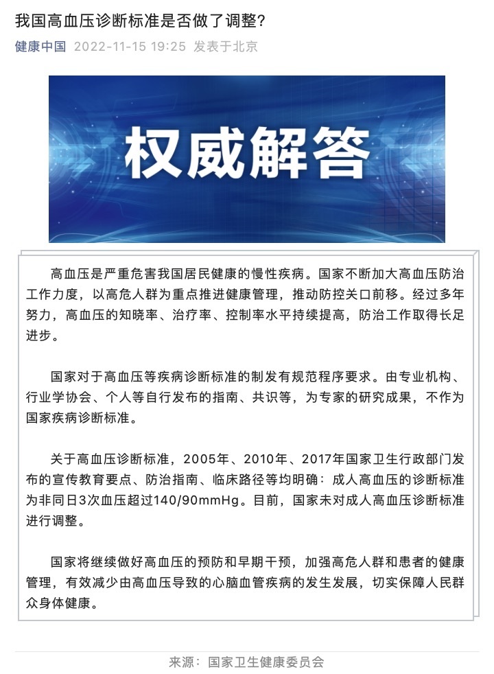 國家對于高血壓等疾病診斷標準的制發(fā)有規(guī)范程序要求。由專業(yè)機構、行業(yè)學協(xié)會、個人等自行發(fā)布的指南、共識等,為專家的研究成果,不作為國家疾病診斷標準。