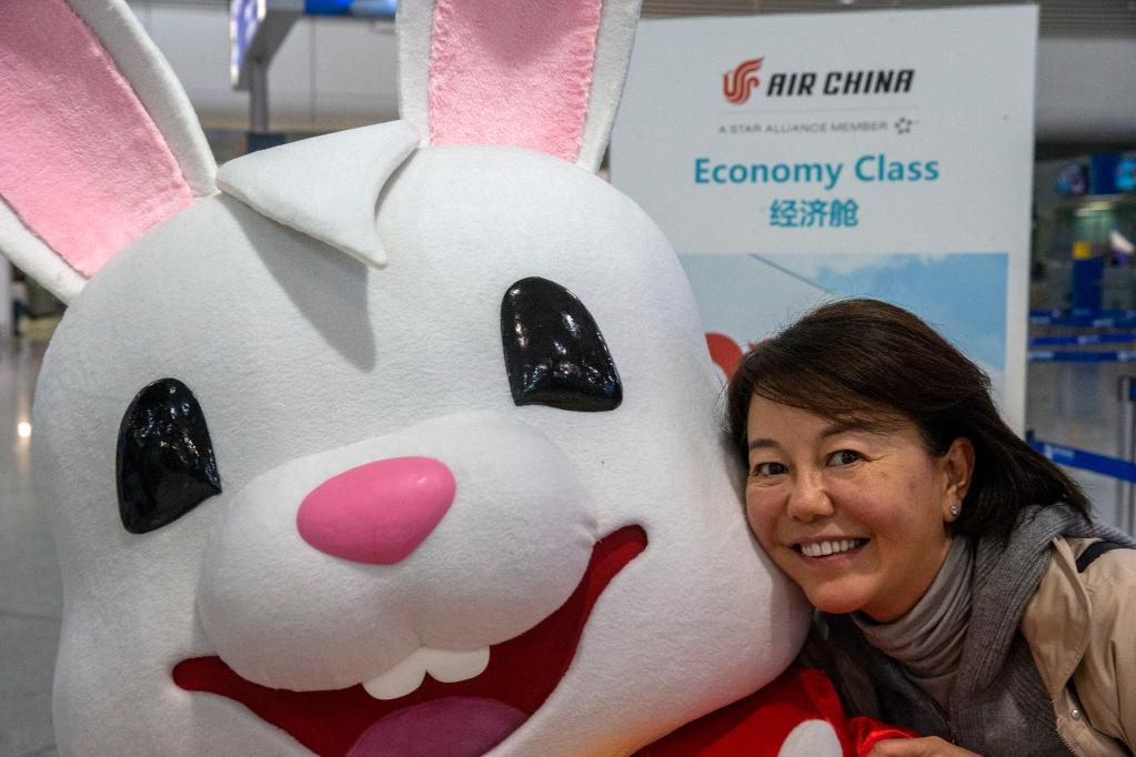 1月26日,在希臘雅典國際機(jī)場(chǎng),一名準(zhǔn)備搭乘航班前往中國的乘客與裝扮成兔子造型的工作人員合影。(新華社發(fā),馬里奧斯·羅洛斯攝)
