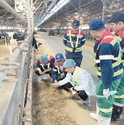 全國人大代表、內(nèi)蒙古蒙牛乳業(yè)(集團)股份有限公司研發(fā)創(chuàng)新部研發(fā)總監(jiān)史玉東(前排左三)在當(dāng)?shù)啬膛pB(yǎng)殖場調(diào)研。全國人大常委會辦公廳聯(lián)絡(luò)局供圖
