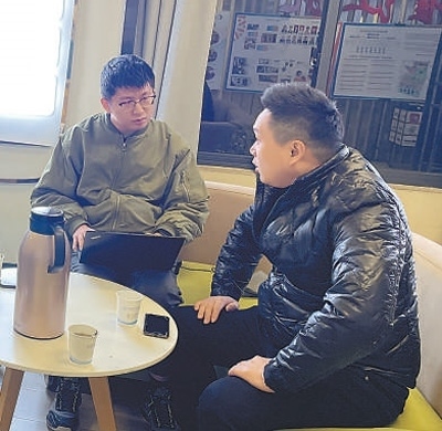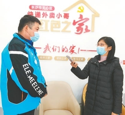 湖南分社記者王云娜(右)在湖南省長(zhǎng)沙市天心區(qū)坡子街街道楚湘社區(qū)“快遞外賣小哥紅色之家”采訪。 李蔓蔓攝