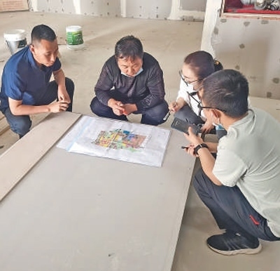 劉振興(左一)在策勒縣天津工業(yè)園區(qū)津和數(shù)字電子展館施工現(xiàn)場(chǎng)辦公。天津援疆前方指揮部供圖