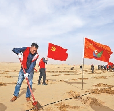 天津援疆策勒工作組在沙漠植樹。天津援疆前方指揮部供圖