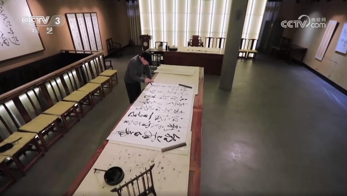 中國(guó)書(shū)法家協(xié)會(huì)草書(shū)專(zhuān)業(yè)委員會(huì)副主任、上海市書(shū)法家協(xié)會(huì)主席 丁申陽(yáng):武打的場(chǎng)面,他(導(dǎo)演)說(shuō)后面一堵墻,你可以用草書(shū)來(lái)書(shū)寫(xiě),掛在后面作背景。他說(shuō)這個(gè)草書(shū)跟武術(shù)其實(shí)有相同點(diǎn),都是動(dòng)態(tài)的美,也有左右避讓的關(guān)系,長(zhǎng)短的協(xié)調(diào)的關(guān)系,還有重輕的關(guān)系,矛盾平衡之間尋找一個(gè)點(diǎn),這個(gè)點(diǎn)就是協(xié)調(diào),協(xié)調(diào)就是美的。