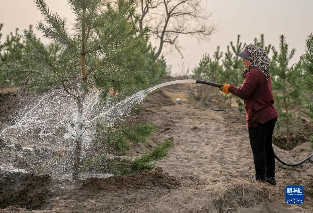 4月15日,在內(nèi)蒙古通遼市科爾沁左翼后旗,治沙工人在科爾沁沙地給樹木澆水。