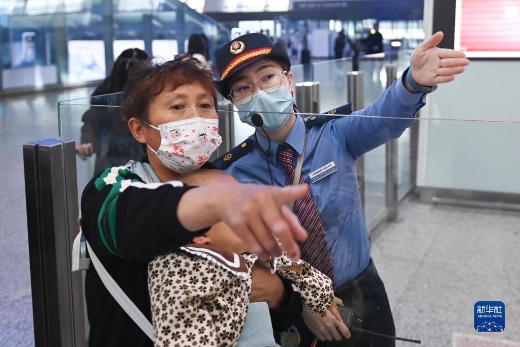 5月1日,在杭州東站候車大廳,客運員陳思悅引導旅客前往檢票口。