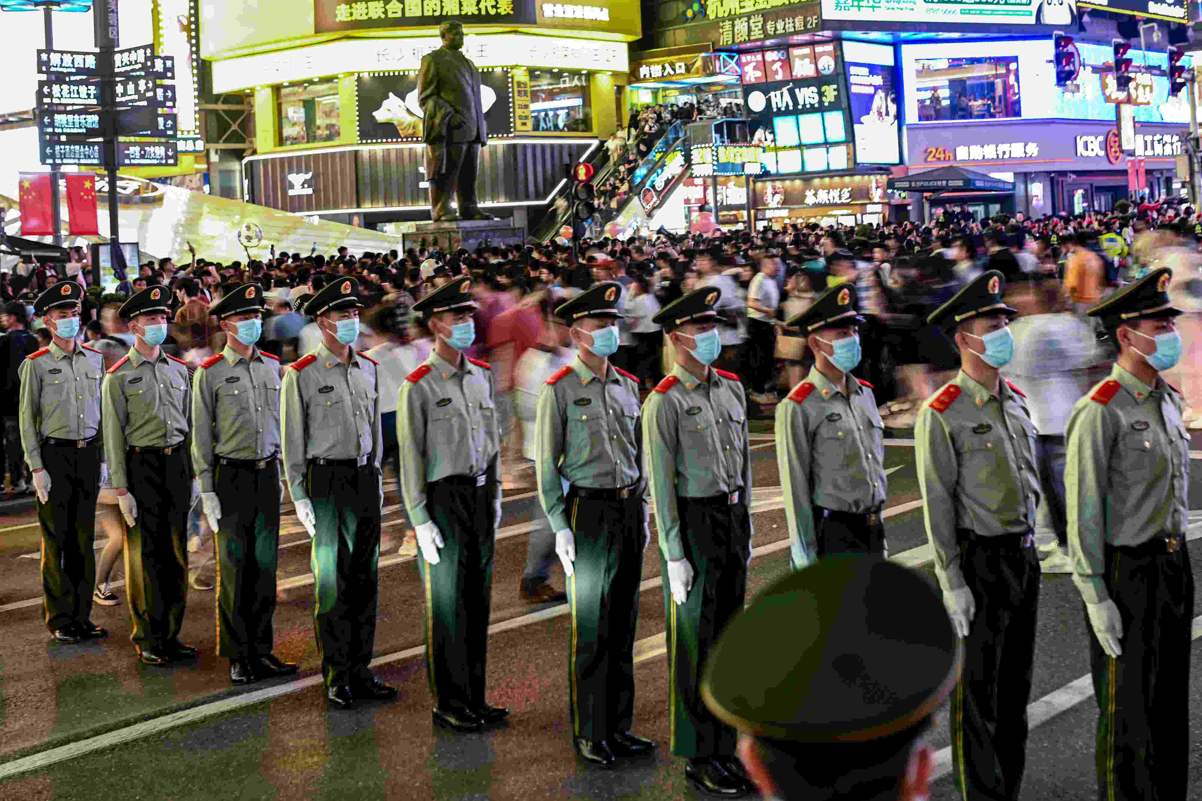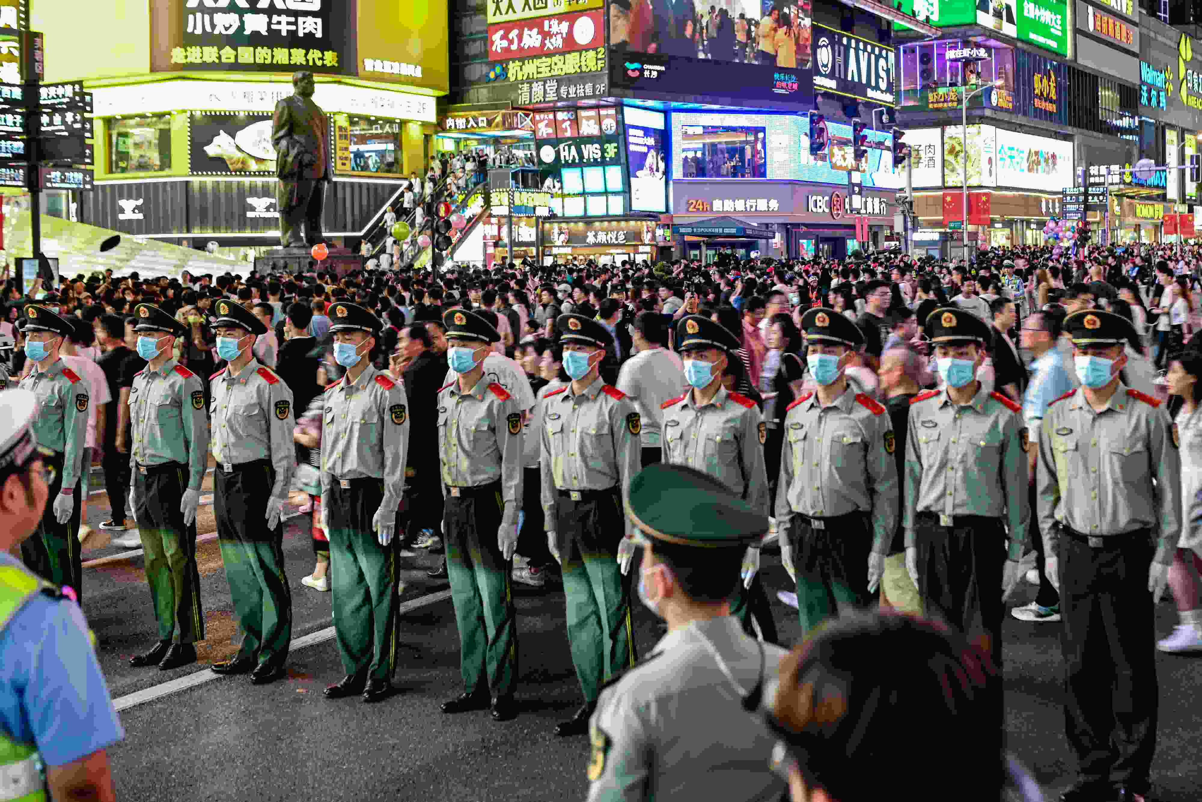 2023年5月1日,長沙,“五一”小長假,五一商圈成為眾多游客必到打卡地,為了保障人民群眾的安全,武警長沙支隊(duì)官兵同長沙公安民警一道,在市中心解放西路與黃興中路的十字路口,筑起“人墻”,守護(hù)行人安全通行。 視覺中國