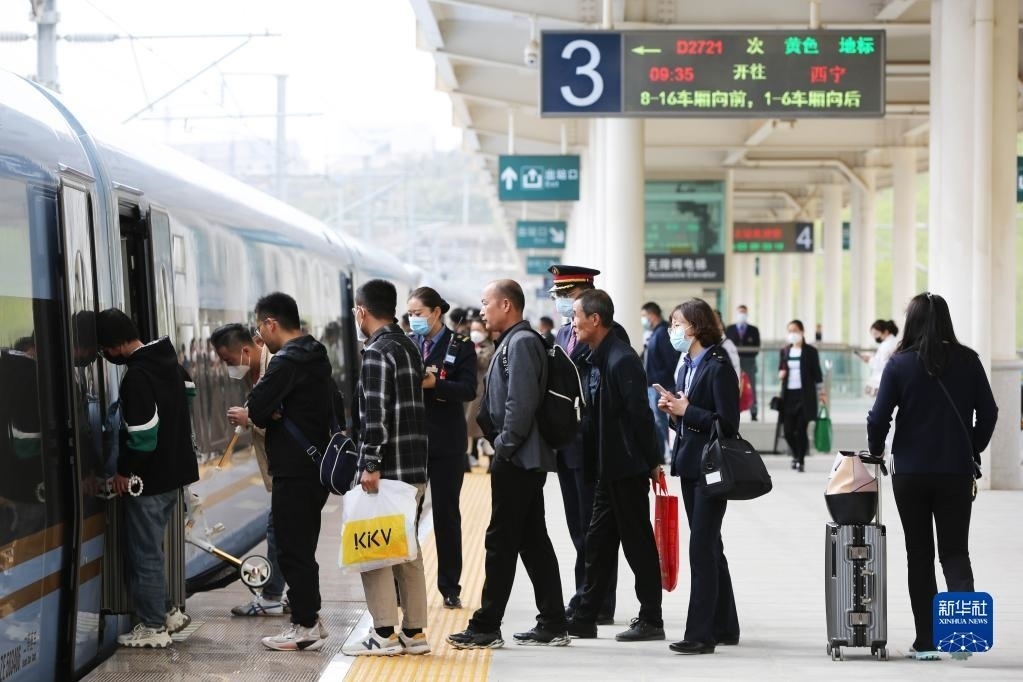 5月3日,旅客在寶蘭高鐵甘肅定西北站站臺乘車出行。
