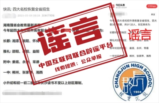 真相:近日,一些網(wǎng)站和自媒體平臺(tái)發(fā)布“今年起,長(zhǎng)郡中學(xué)、雅禮中學(xué)、湖南師大附中、長(zhǎng)沙市一中等長(zhǎng)沙‘四大名?!跎呋謴?fù)全省招生”的信息引發(fā)關(guān)注。5月4日,湖南省教育廳對(duì)此發(fā)布聲明稱,此消息為不實(shí)消息。湖南省自2021年全面規(guī)范普通高中招生,禁止跨區(qū)域招生,并對(duì)違規(guī)招生行為進(jìn)行嚴(yán)肅查處。請(qǐng)大家不信謠不傳謠。(來(lái)源:湖南省教育廳微信公眾號(hào))