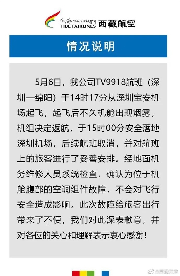 ·西藏航空回應(yīng)航班機(jī)艙內(nèi)出現(xiàn)濃煙返航:空調(diào)組件故障。