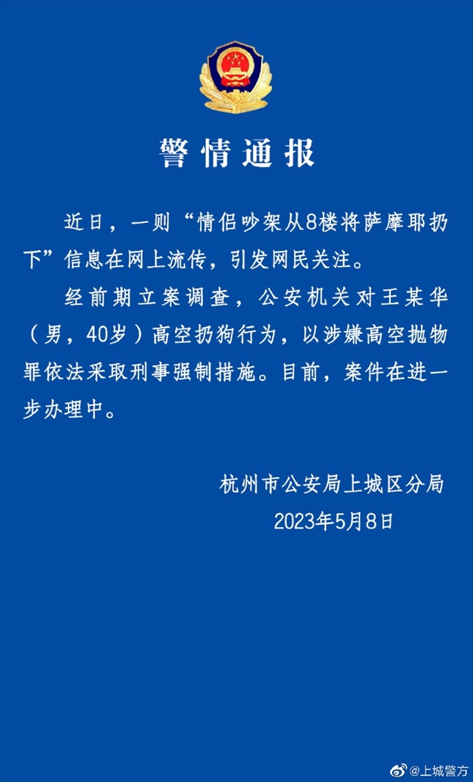 ·情侶吵架從8樓將薩摩耶扔下,杭州警方:男子被采取刑事強(qiáng)制措施。
