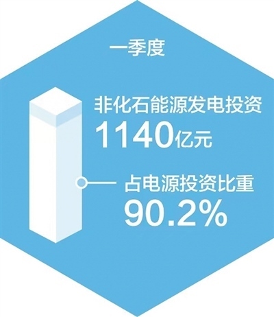 非化石能源發(fā)電投資較快增長。一季度,全國主要發(fā)電企業(yè)電源工程完成投資1264億元,同比增長55.2%,其中非化石能源發(fā)電投資1140億元,同比增長62.8%,占電源投資的比重達到90.2%。具體看,太陽能發(fā)電、核電、風電投資同比分別增長177.6%、53.5%、15%。