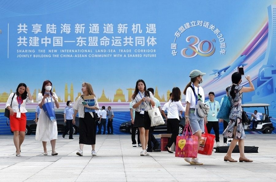 2021年9月11日,在廣西南寧國際會(huì)展中心,參觀者走出第18屆中國—東盟博覽會(huì)展館。新華社記者 陸波岸 攝