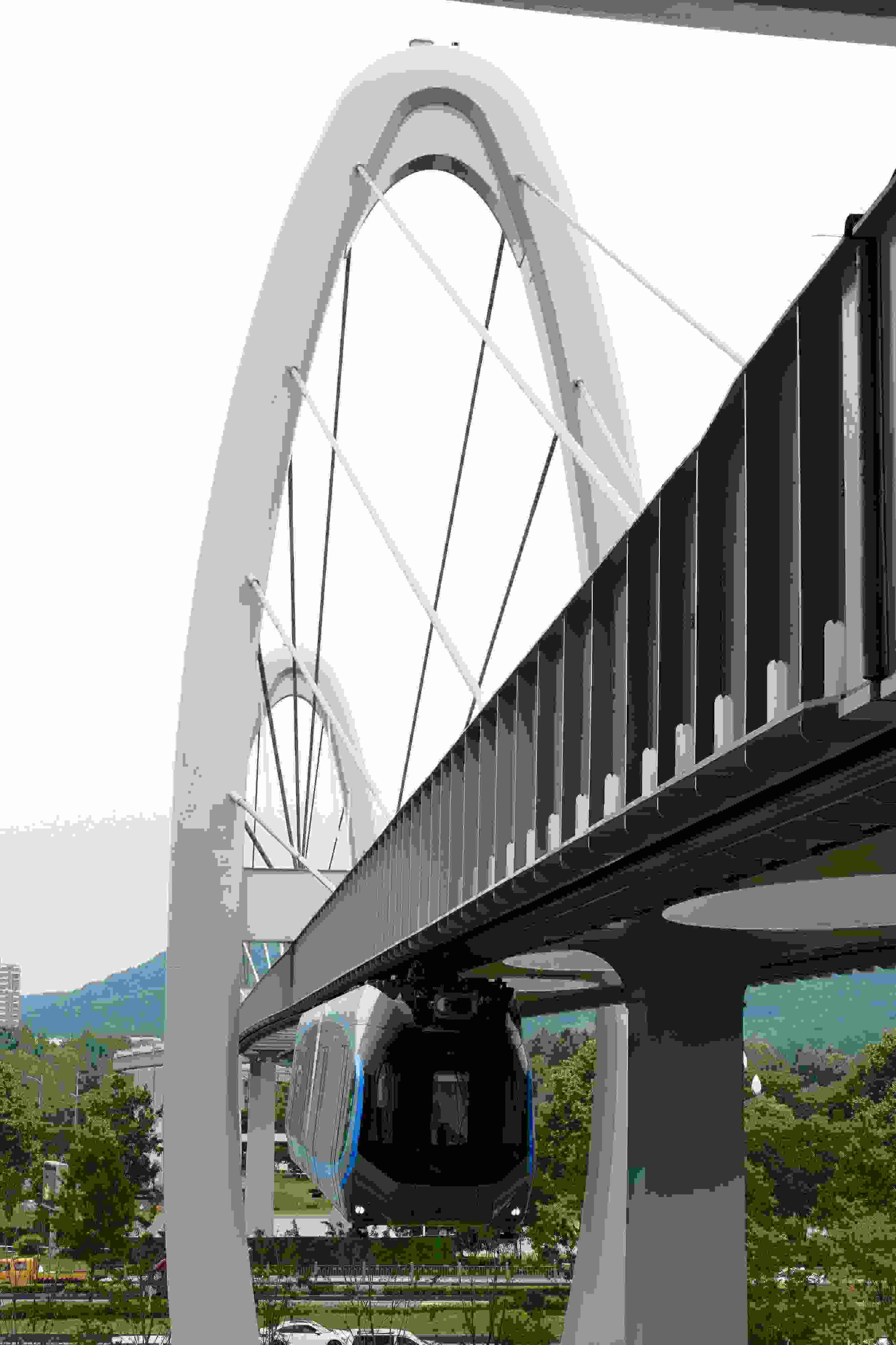 2023年5月11日,武漢,光谷空軌旅游線項(xiàng)目“光谷光子號(hào)”空中軌道列車在東湖高新區(qū)試跑。武漢光谷空軌旅游線項(xiàng)目位于武漢市東湖高新區(qū)光谷中央生態(tài)大走廊內(nèi),是生態(tài)大走廊旅游配套基礎(chǔ)設(shè)施之一。其規(guī)劃總長(zhǎng)26.7公里,先行建設(shè)的一期工程長(zhǎng)約10.5公里,設(shè)車站6座。 視覺中國(guó)