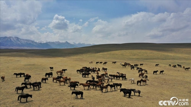 甘肅張掖,初夏時(shí)節(jié),位于祁連山下的山丹馬場(chǎng)積雪消融,草原開(kāi)始泛綠,成群的馬匹正在吃草,一派生機(jī)勃勃的景象。