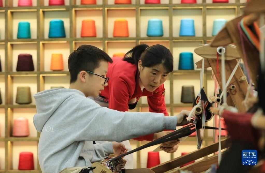 5月12日,來自上海包玉剛實(shí)驗(yàn)學(xué)校的學(xué)生在張家界市武陵源區(qū)乖幺妹土家族織錦基地學(xué)習(xí)體驗(yàn)土家族織錦非遺技藝。
