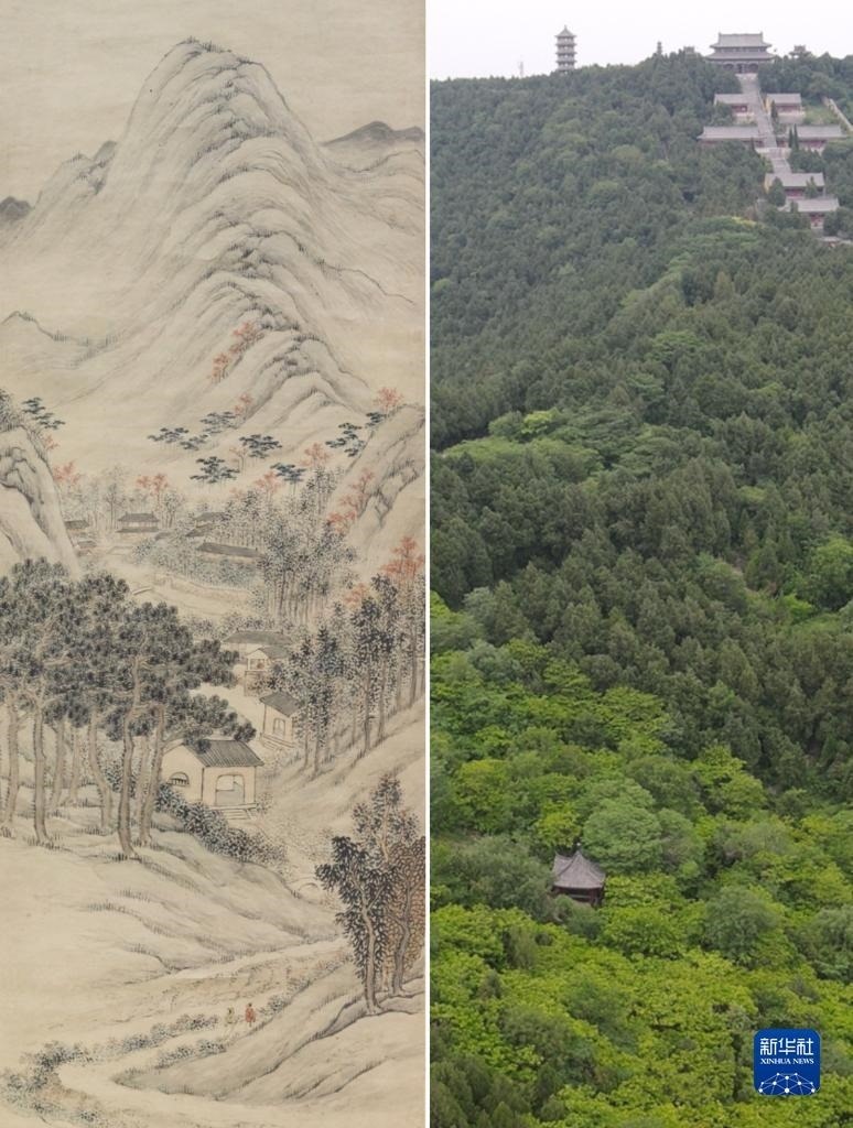 這是一張拼版照片,左圖為:《八公秋霽圖》,由清代畫家潘思牧創(chuàng)作,現(xiàn)收藏于安徽博物院(新華社發(fā),李鵬飛 攝);右圖為:5月16日拍攝的位于安徽省淮南市壽縣的八公山風景區(qū)(無人機照片,新華社記者張端攝)。