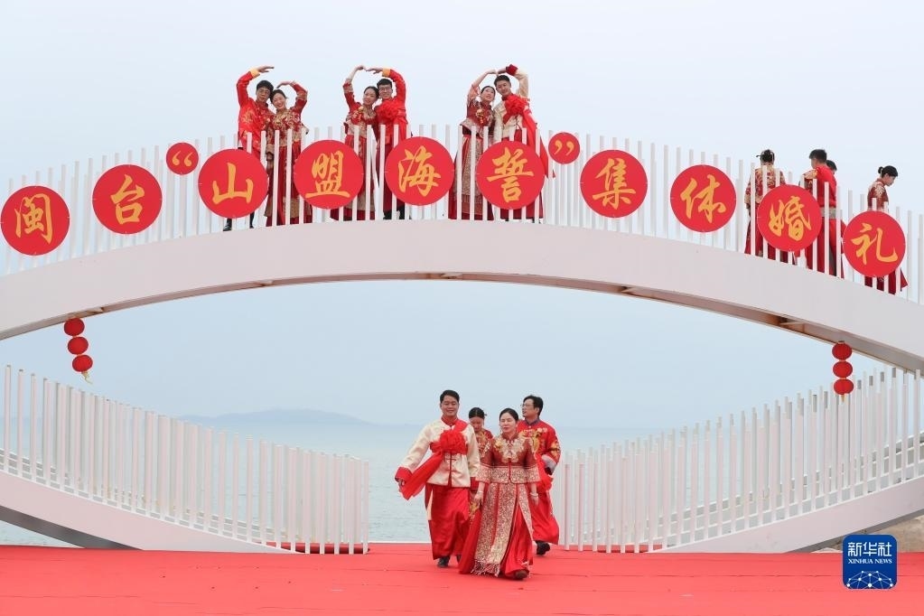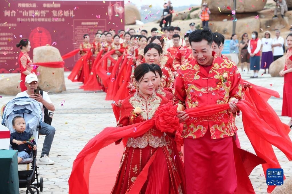 當(dāng)日,一場(chǎng)以“愛情恒久遠(yuǎn)、幸福長(zhǎng)相伴”為主題的閩臺(tái)“山盟海誓”集體婚禮暨2023年閩臺(tái)婚姻家庭交流活動(dòng)在福建省福州市平潭縣舉辦。21對(duì)閩臺(tái)新人身穿紅色中式婚服,手牽紅繡球,行跨火盆、踩瓦片、扎繡球和“合茶”、“合巹”、“海誓”等閩臺(tái)傳統(tǒng)結(jié)婚禮儀,結(jié)下跨越海峽的姻緣。