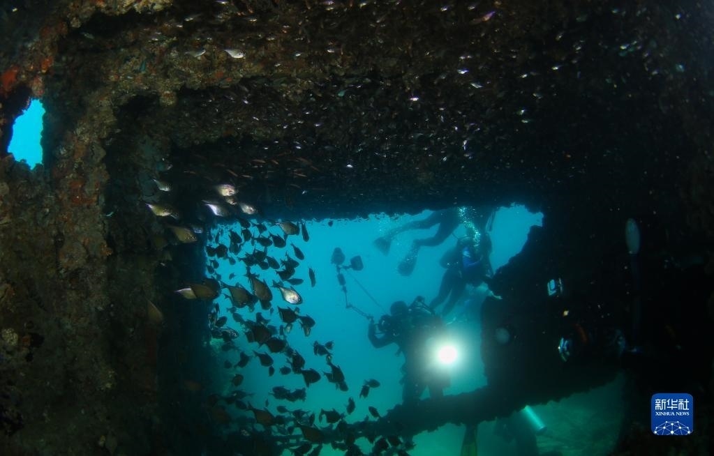 攝影愛(ài)好者在蜈支洲島海域海洋牧場(chǎng)拍攝沉船魚礁內(nèi)的魚群(2021年5月21日攝)。