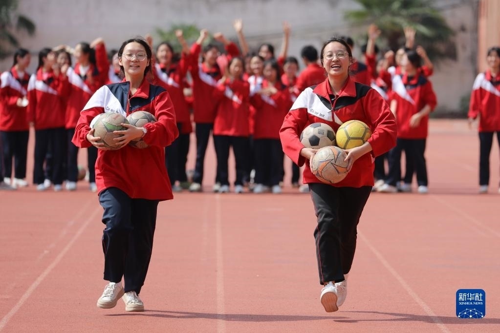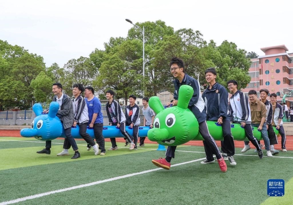 5月24日,在貴州省黔東南苗族侗族自治州岑鞏縣第一中學(xué),高三學(xué)生在足球場(chǎng)上做游戲減壓。