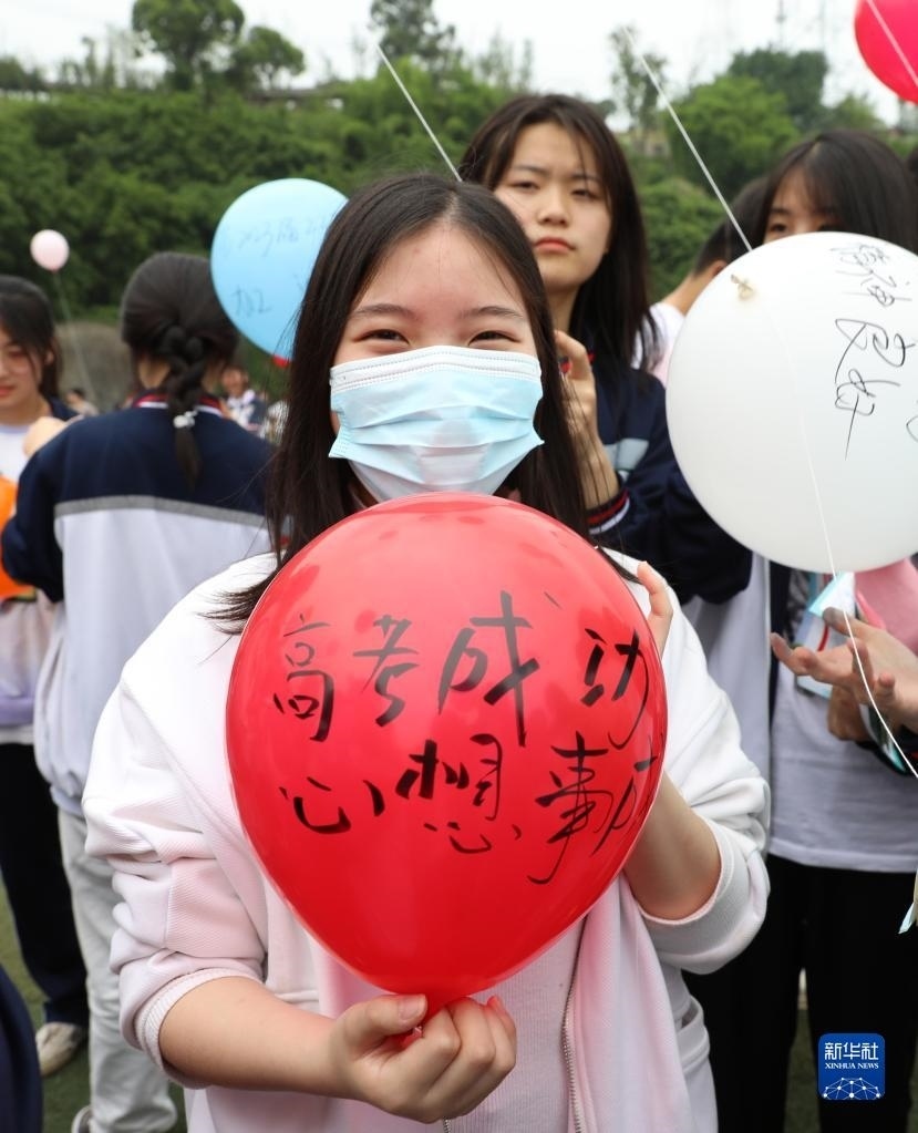 5月23日,在四川省廣安市武勝中學(xué),一名高三學(xué)生在氣球上寫下祝福與愿望準(zhǔn)備放飛。