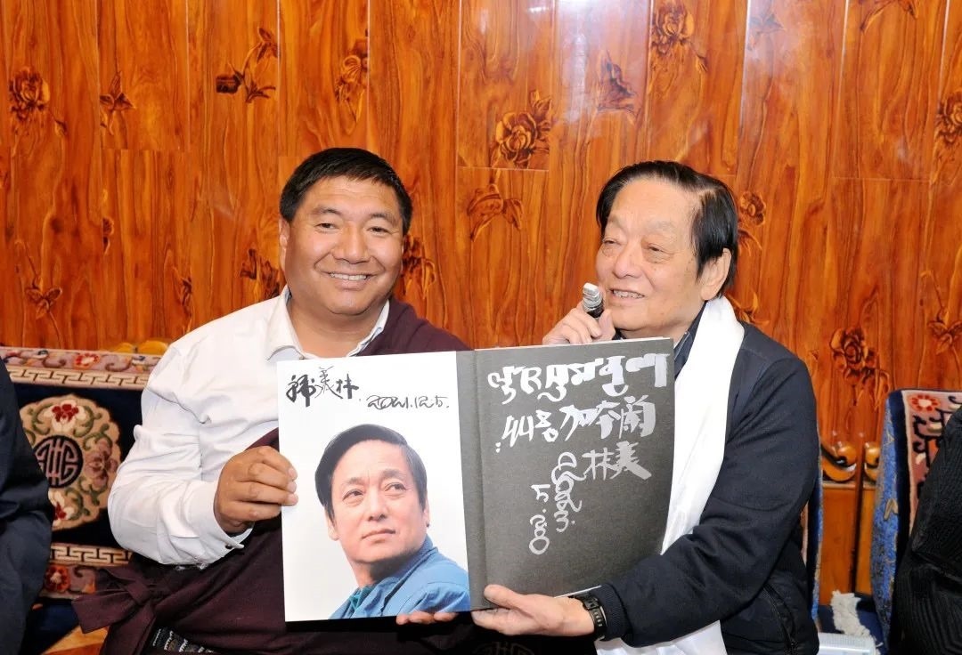 ▲韓美林為原青海省第十二屆人大常委會(huì)黨組副書(shū)記,現(xiàn)三江源生態(tài)保護(hù)基金會(huì)理事長(zhǎng)鄧本太簽書(shū)留念