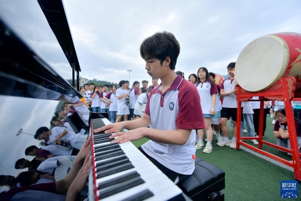 5月29日,在湖北省宣恩縣第一高級(jí)中學(xué)的快閃活動(dòng)現(xiàn)場(chǎng),學(xué)生在彈奏鋼琴。